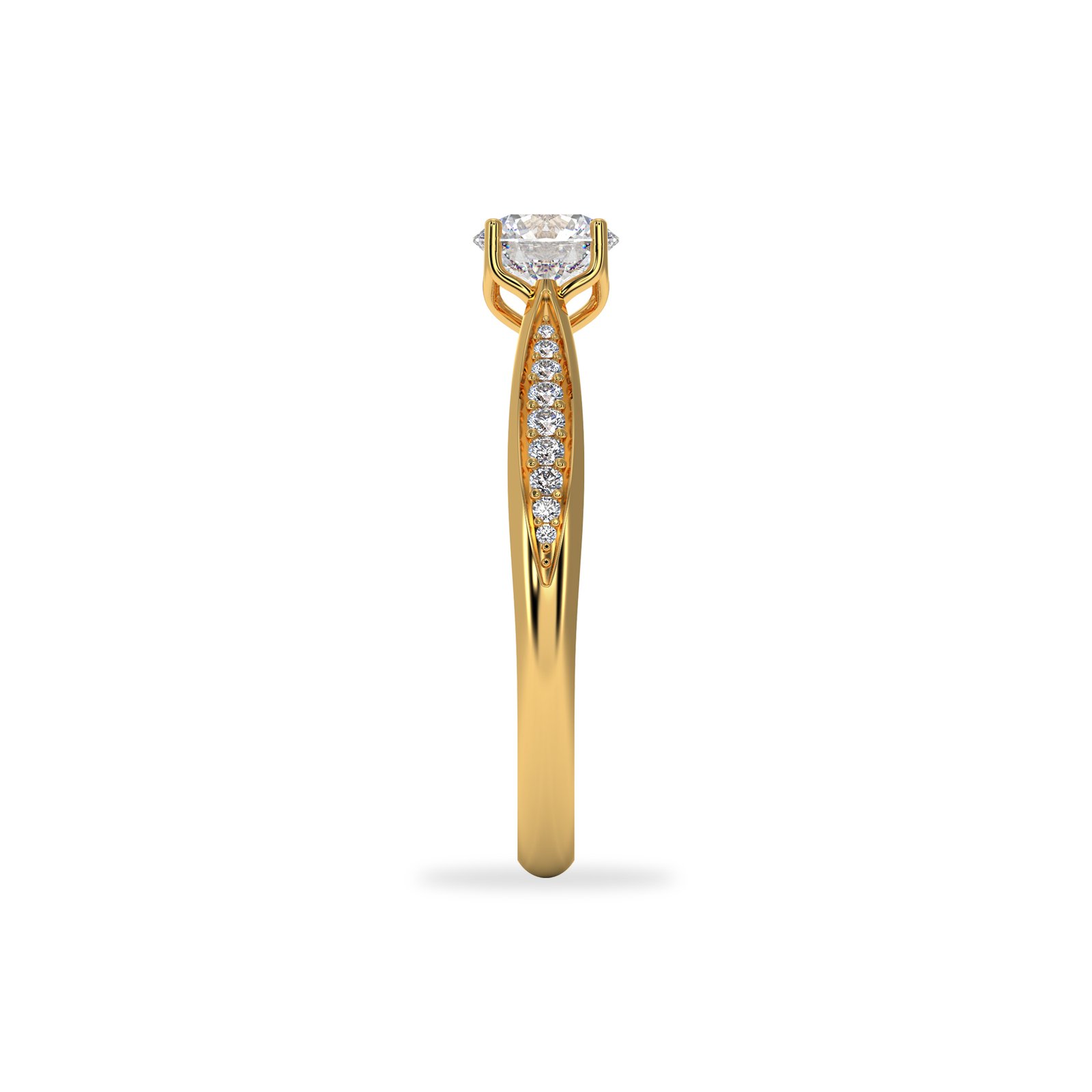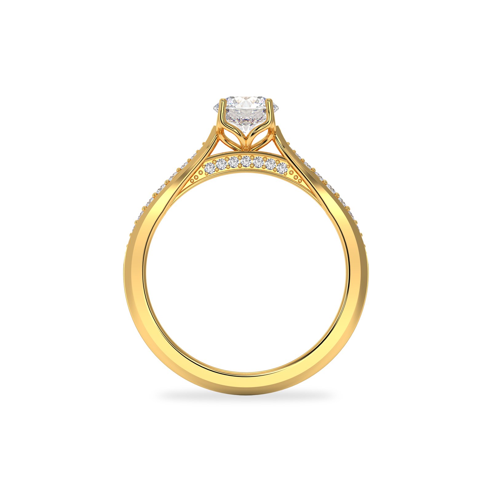 This elegant round cut solitaire engagement ring features a brilliant 6.00 mm center stone (approximately 0.75 carats) set in a secure prong setting that maximizes sparkle and brilliance. The slim band is beautifully accented with pavé diamonds, adding subtle shimmer while keeping the focus on the stunning center stone.