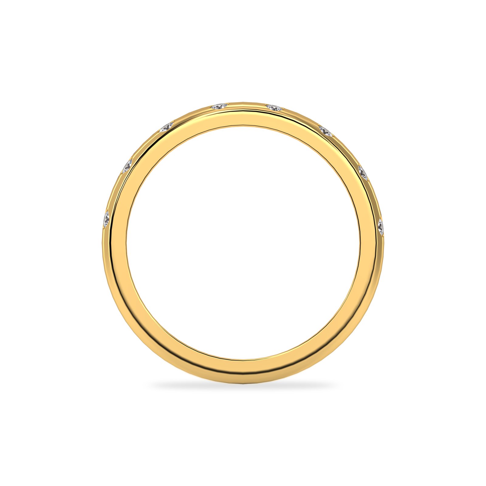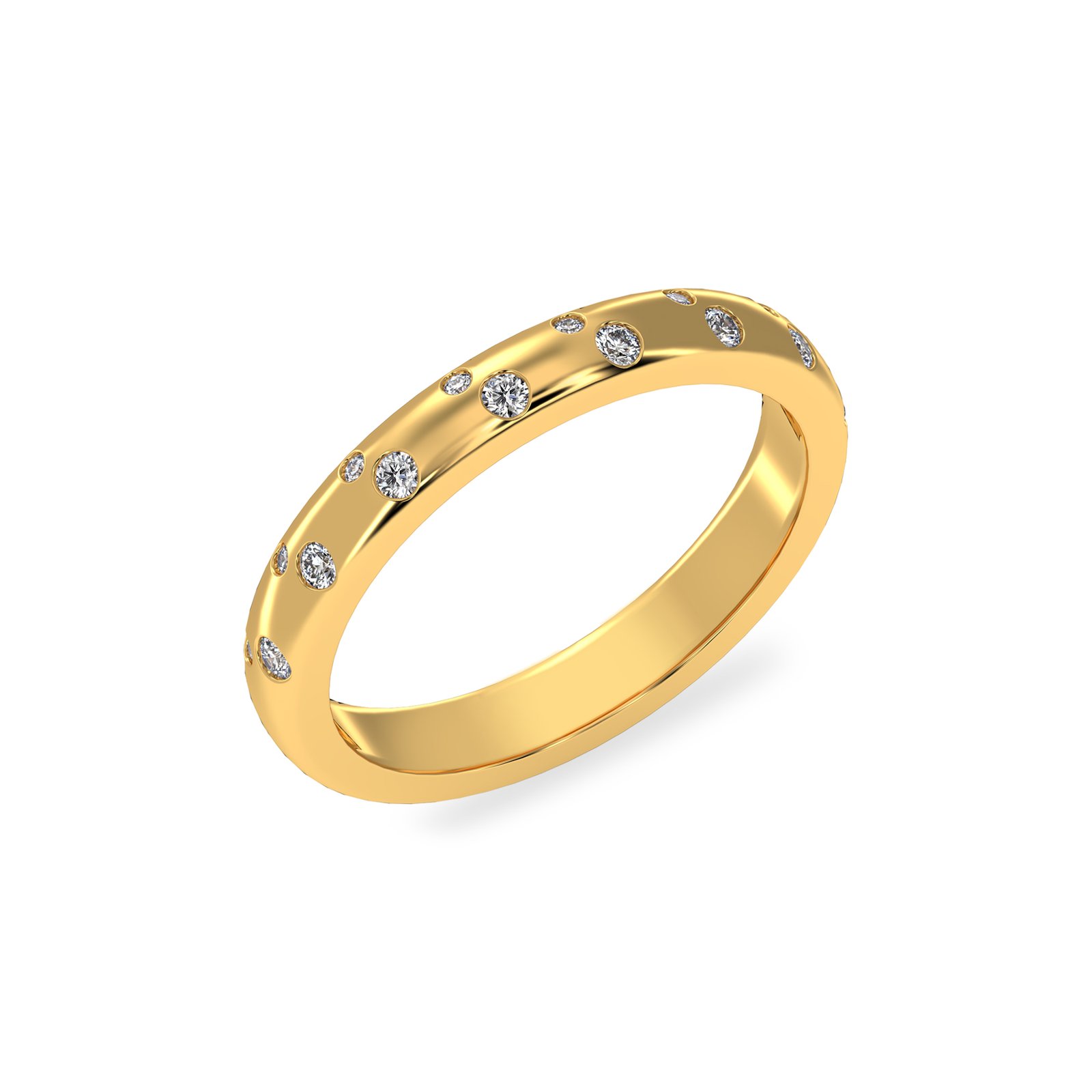 Each diamond is securely flush-set into the smooth gold surface, allowing the stones to sit safely within the band while maintaining a polished and comfortable profile. This setting style protects the diamonds while keeping the ring sleek, making it perfect for everyday wear.