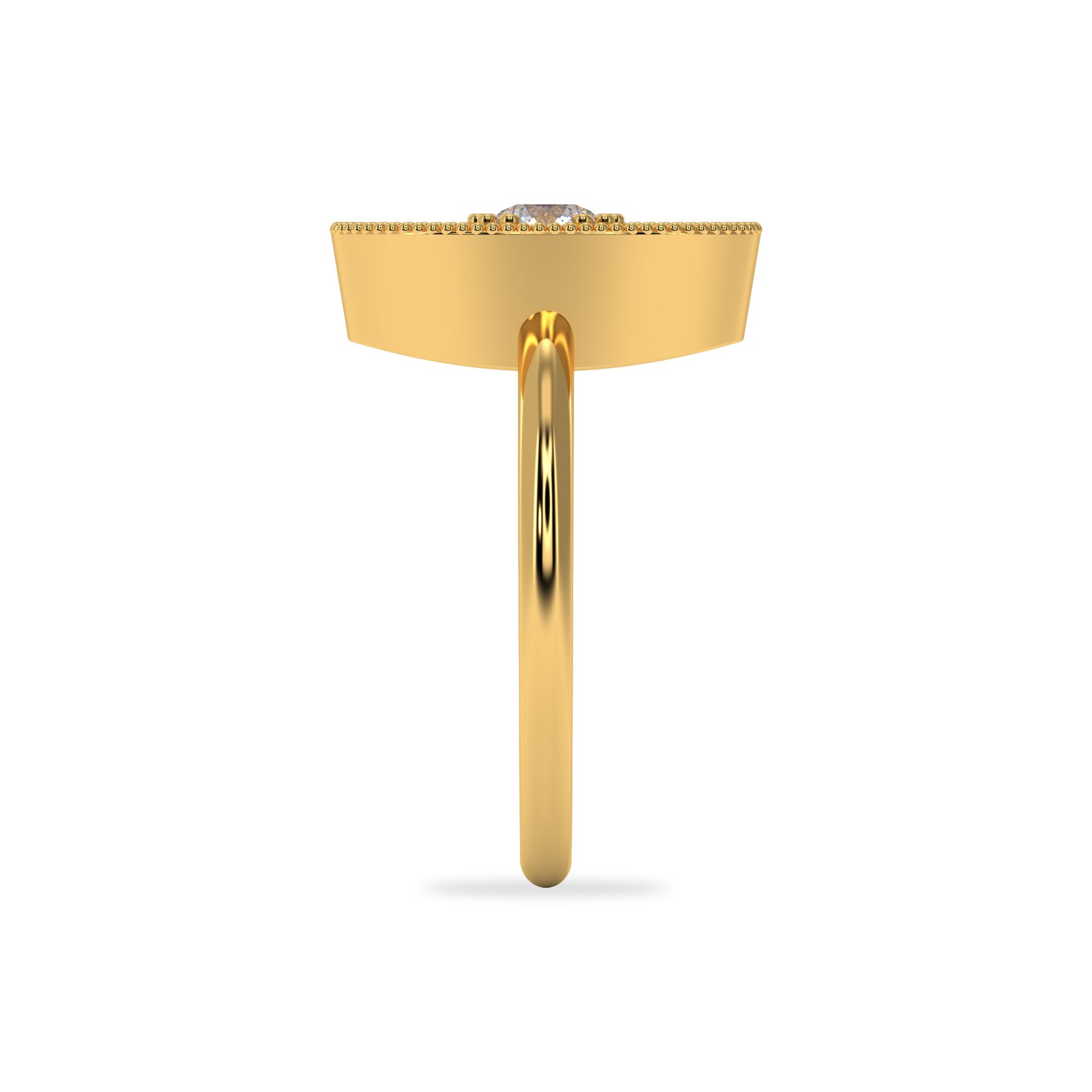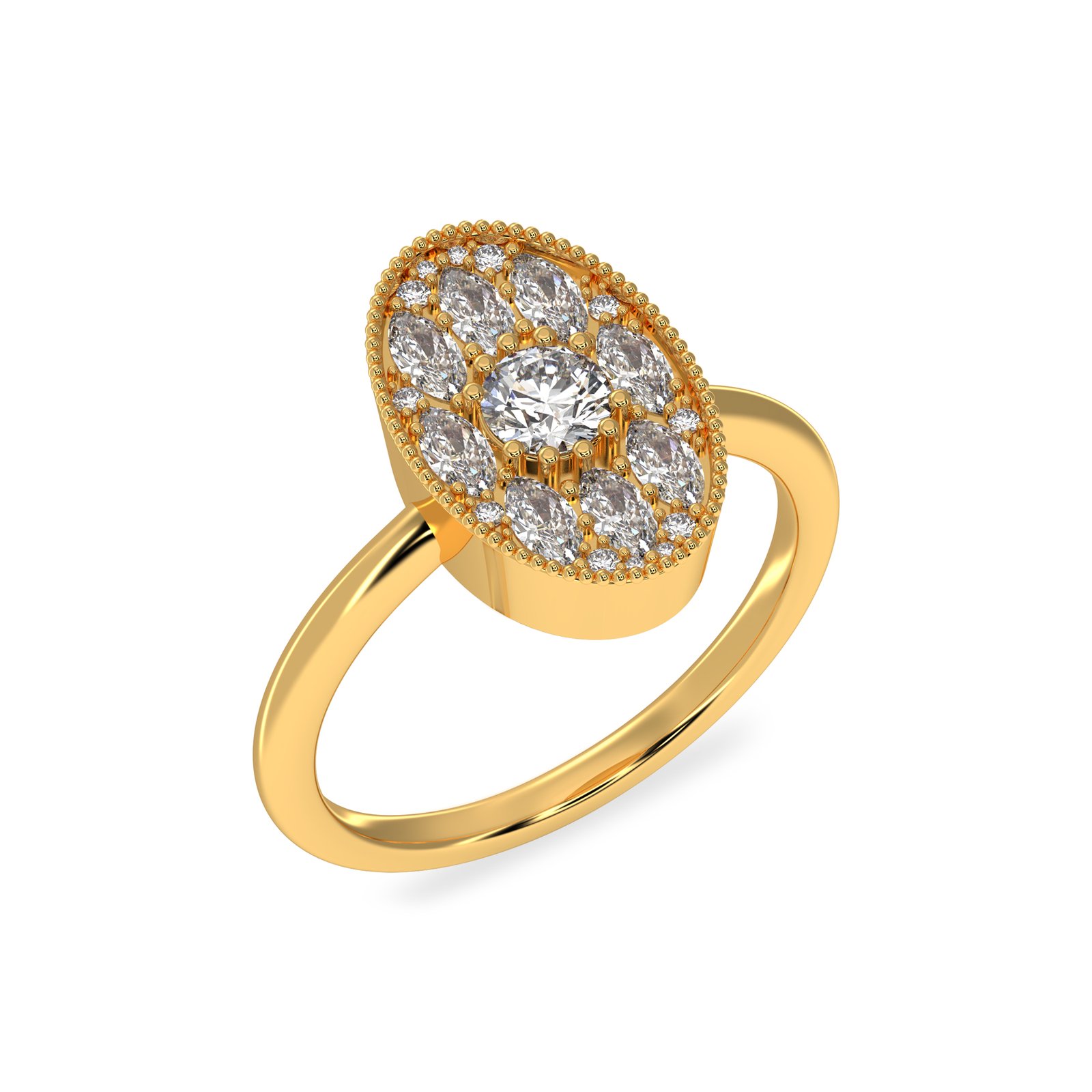 This image shows an elegant yellow gold diamond ring with a vintage-inspired design. The ring features a polished, slender yellow gold band that supports an elongated oval-shaped cluster at the top. At the center sits a round brilliant-cut diamond, which is surrounded by multiple marquise-cut diamonds arranged symmetrically to form an oval halo. Small round accent diamonds fill the spaces between the marquise stones, enhancing the overall sparkle and creating a detailed, intricate pattern. The stones are secured with delicate gold prongs, and the outer edge of the oval cluster is finished with fine milgrain-style bead detailing that adds texture and an antique aesthetic. Overall, the design creates a refined, elegant look with a large, eye-catching diamond cluster while maintaining a slim and graceful band.