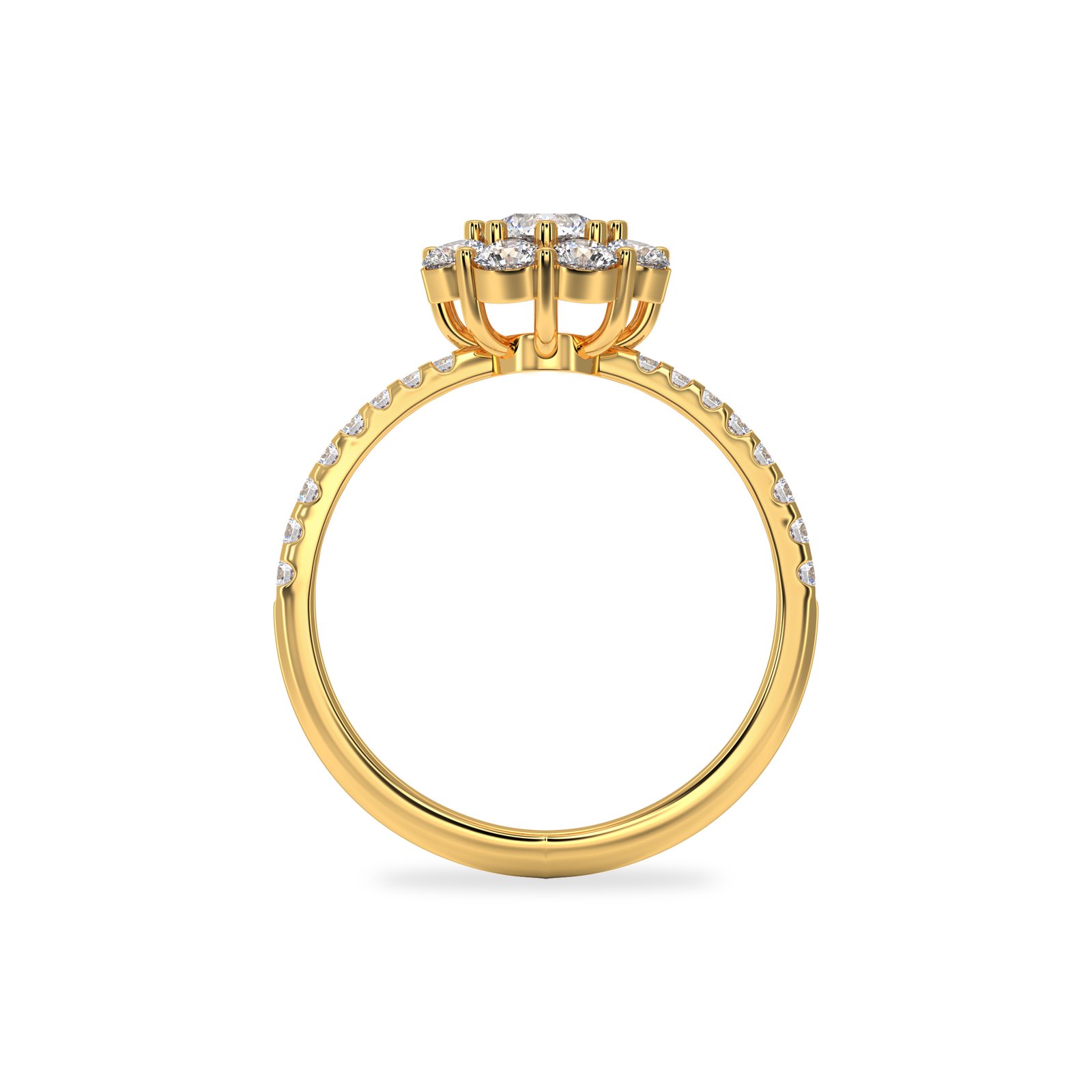 This beautiful floral inspired diamond engagement ring features a sparkling 5.5 mm round center stone (approximately 0.59 carats) surrounded by a halo of round diamonds arranged in a delicate flower cluster design. The petal-like diamond arrangement creates a romantic vintage look while maximizing brilliance and sparkle.